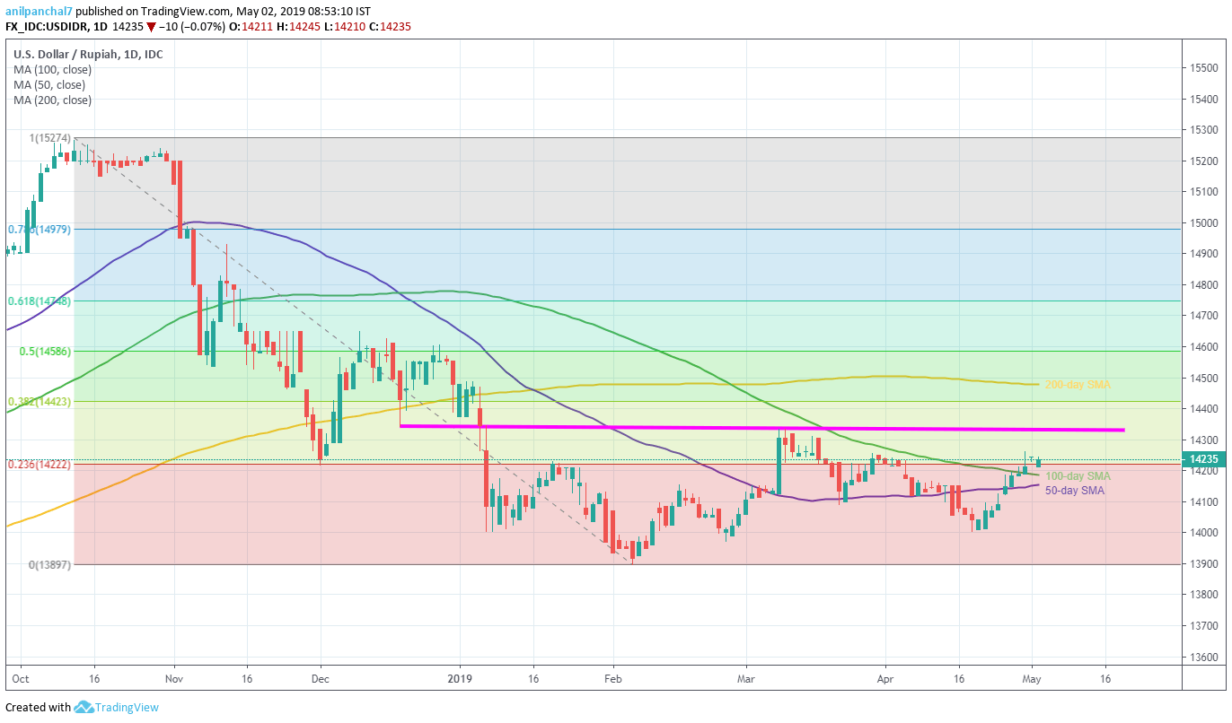 USD/IDR trades near 14,235 during early Thursday ahead of monthly inflation data from Indonesia. Forecasts suggest April month inflation figures to increase on both yearly and monthly basis respectively to 2.69 and 0.32% from 2.48% and 0.11% priors. The core inflation (YoY) is expected to rise to 3.04% from 3.03% earlier.