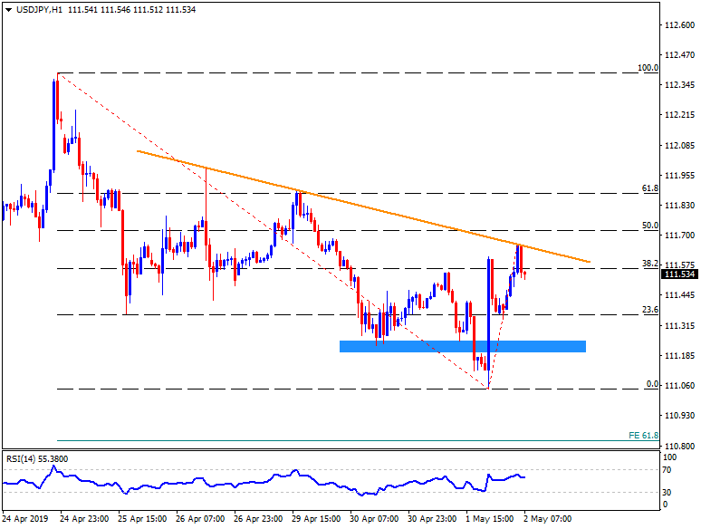 Failure to cross a week-long descending trend-line recently dragged the USD/JPY pair to 111.55 while heading into the European session on Thursday.