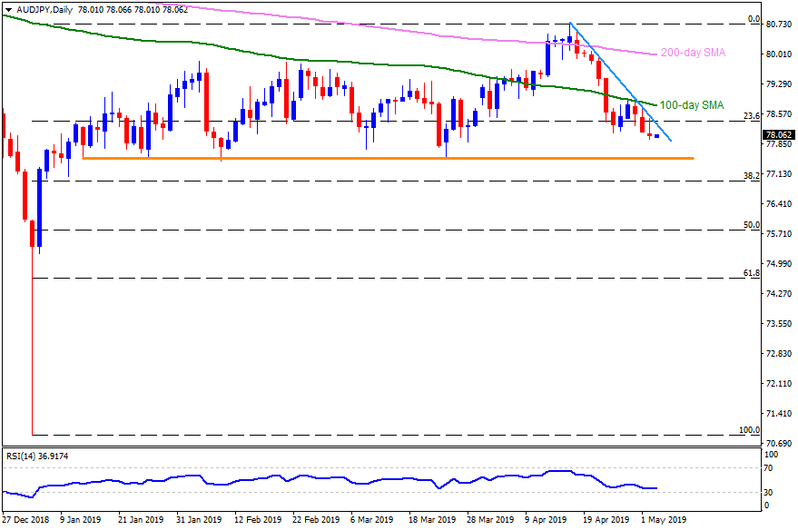 Sustained trading beneath 100-day SMA and a two-week-old descending trend-line portray the AUD/JPY pair’s weakness despite its latest pullback on Aussie service activity gauge to 78.05 during early Friday.