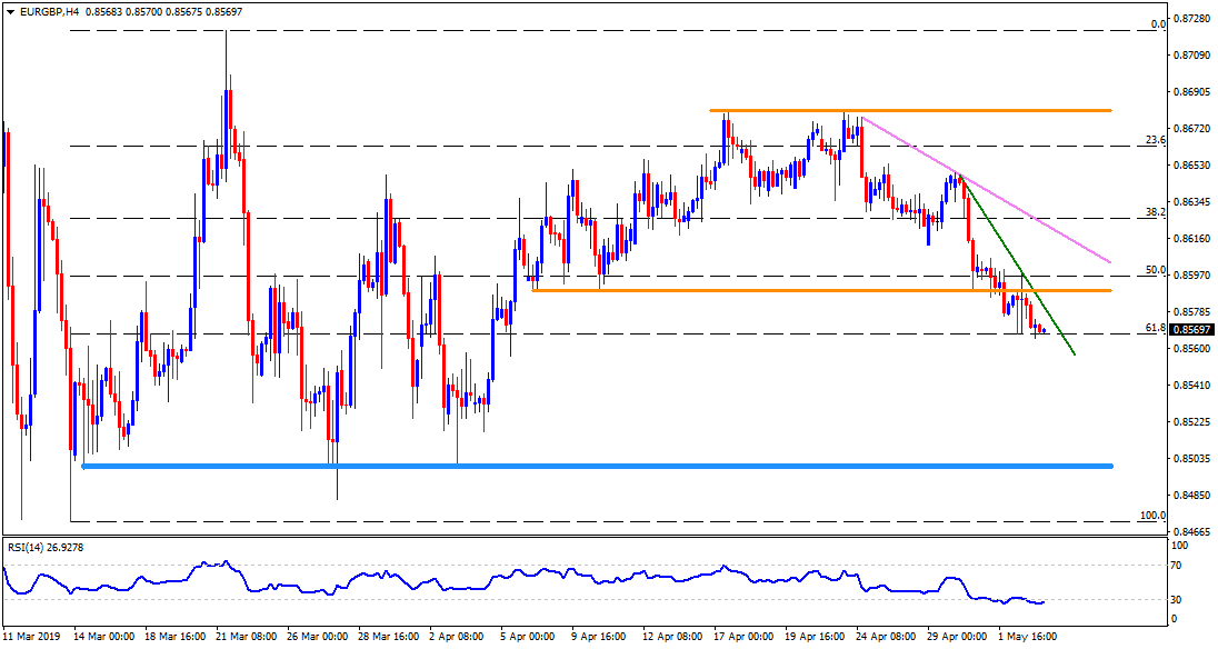 While a break of 0.8590/85 horizontal-support dragged the EUR/GBP pair to a month’s low on early Friday, the quote is currently taking rest on 61.8% Fibonacci retracement of March month upside amid oversold condition of 14-bar relative strength index (RSI).