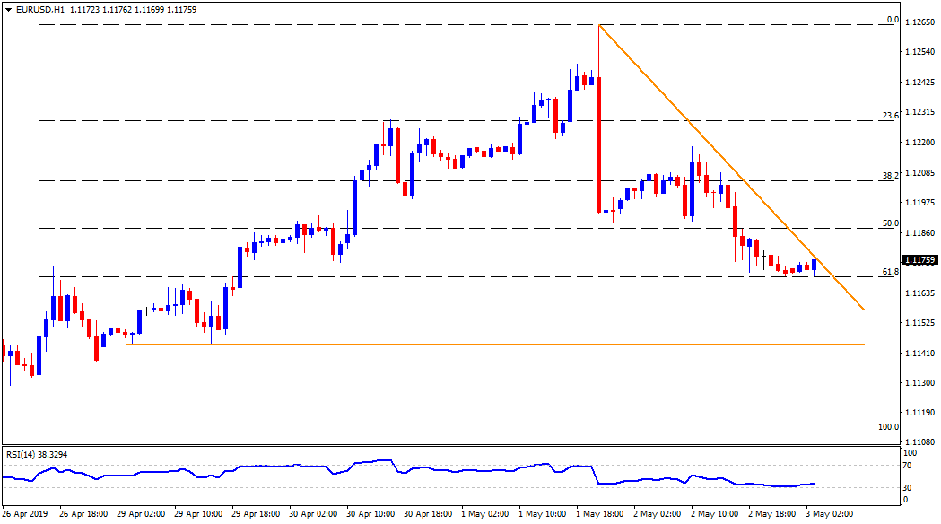 The EUR/USD pair trades near 1.1175 as the bounce from 61.8% Fibonacci retracement of near-term upside propels it towards immediate resistance-line.