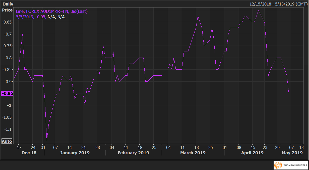 AUD/USD one-month 25 delta risk reversals (AUD1MRR) have dropped to 3.5-month lows, indicating investors are adding bets to position for weakness in the Australian Dollar amid widespread speculation that the Reserve Bank of Australia will on Tuesday cut interest rates for the first time since August 2016.
