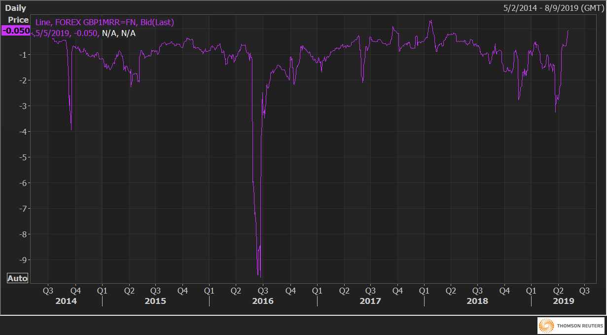 Risk reversals on GBP/USD (GBP1MRR), a gauge of puts to calls on Sterling, have nearly shed bearish bias amid Brexit optimism.