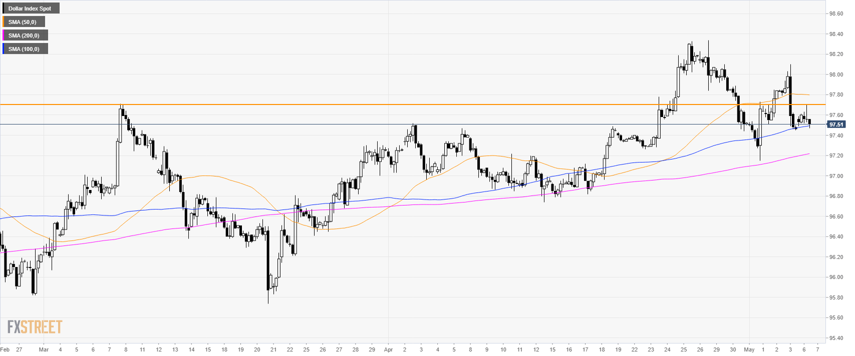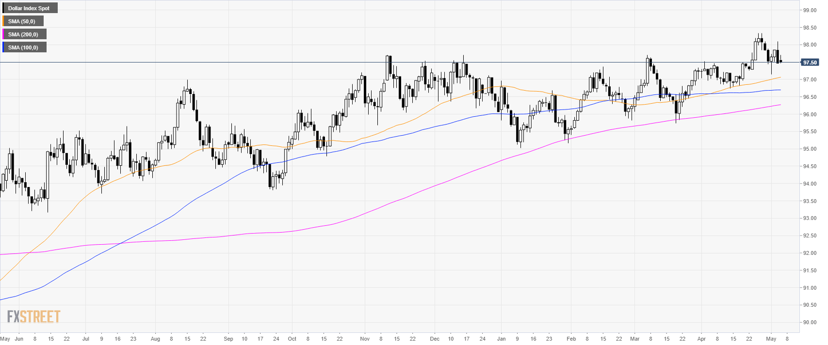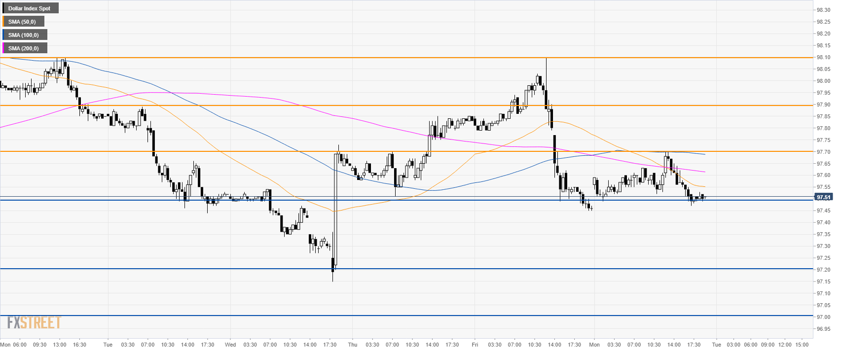 US Dollar Index Technical Analysis: DXY bears pressuring daily lows near 97.50 level