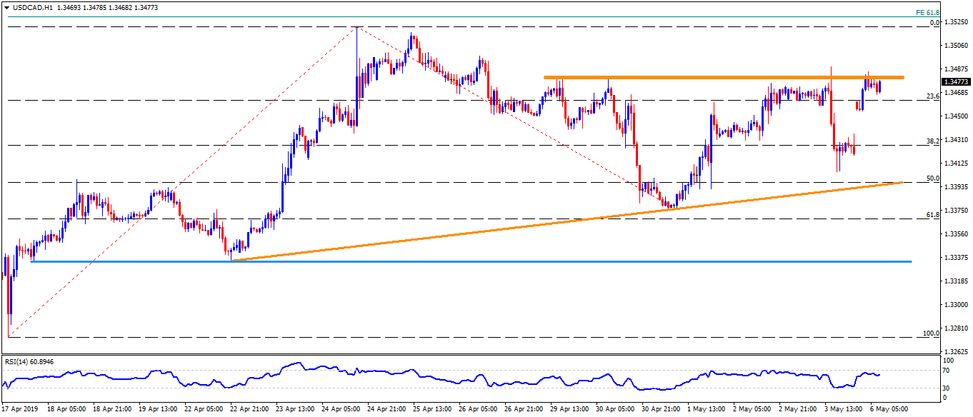 Despite witnessing failures to cross 1.3480/85 resistance-region, the USD/CAD pair still trades beyond 23.6% Fibonacci retracement near 1.3477 during early Monday.