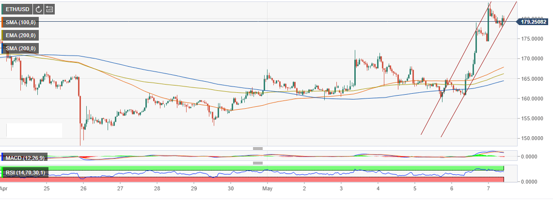 Meanwhile, we see the intraday charts for ETH/USD trading pair trending upwards 2.94%. Since the last week of April, the price consolidated above $160 (support congestion) while the upside stayed limited at $170. However, the news on ETH futures revived investor interest in the crypto as the price corrected upwards above the 100 SMA 1-hour and later break above $170. Continued bullish pressure within an ascending channel zoomed above $180 but came short of $185 forming a high at $184.08.