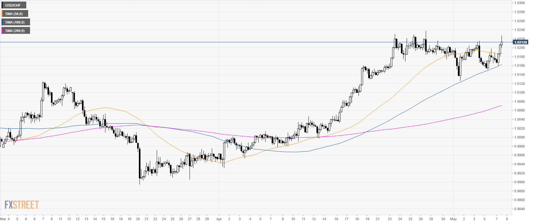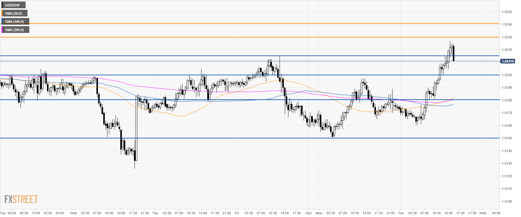 - USD/CHF is trading at multi-month highs above the 1.0220 level.
