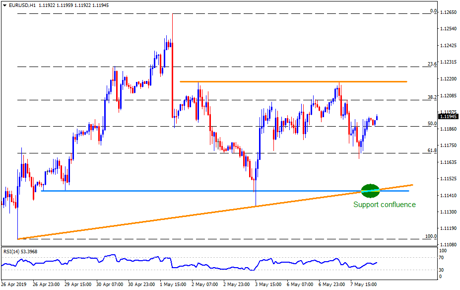 The pair recently took a U-turn from 61.8% Fibonacci retracement of late-April to early-May rise and is presently running towards 1.1220 horizontal resistance surrounded by highs marked since May 02.
