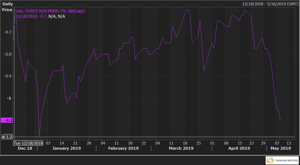 NZD/USD one-month 25 delta risk reversals (NZD1MRR) are currently trading at -1.1 in favor of put options (bearish bets).