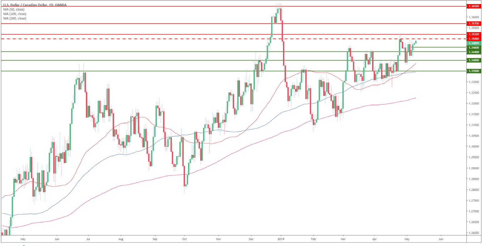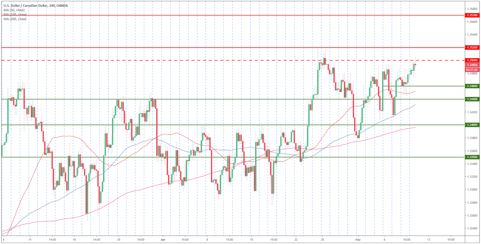 USD/CAD technical analysis: Greenback trades near daily highs just below 1.3500 figure against CAD