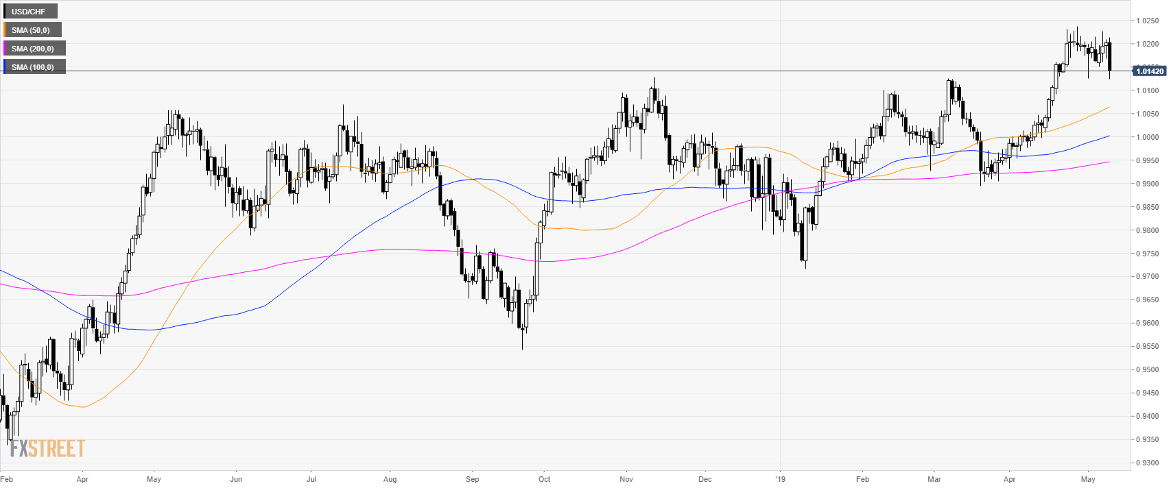 USD/CHF is trading below its 50 and 100 SMAs suggesting a correction down in the medium term.