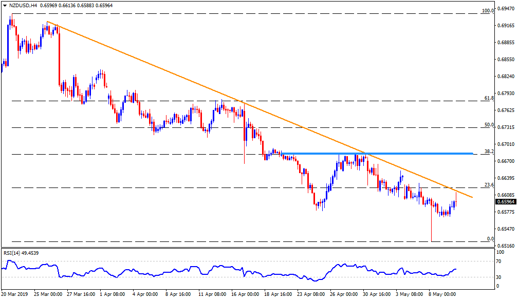 Following its recovery, NZD/USD is trading near 0.6600 ahead of the European session on Friday. However, the pair still trades beneath 0.6620 trend-line resistances that is being stretched since March 26.