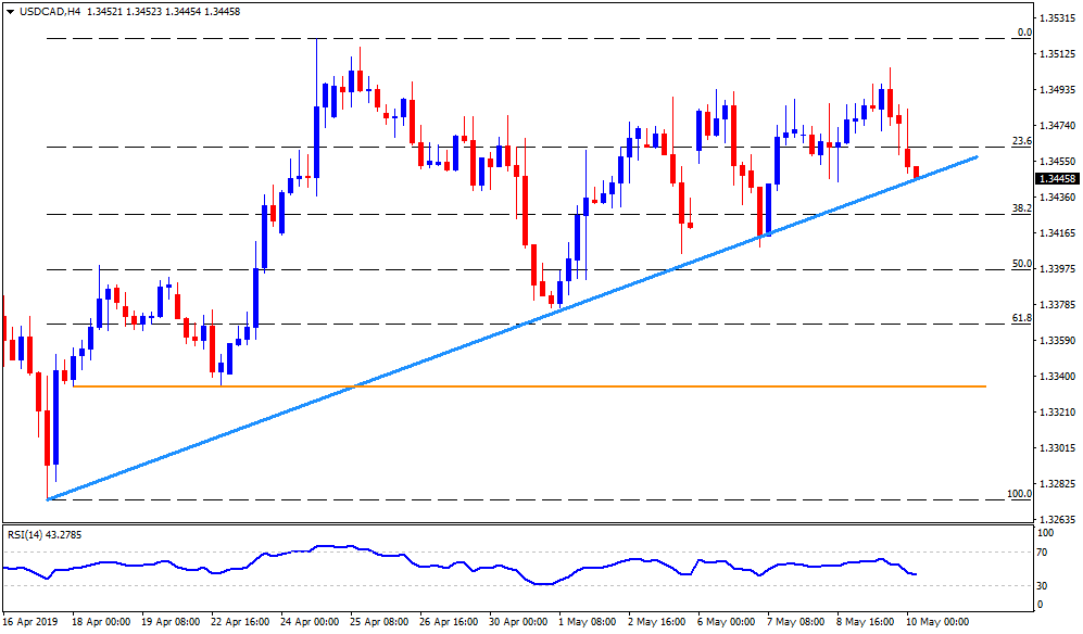 Given the prices dip beneath 1.3445/40 support-line, 50% Fibonacci retracement of its late-April upside near 1.3400 can quickly appear on the chart while current month bottom near 1.3375 may please bears then after.