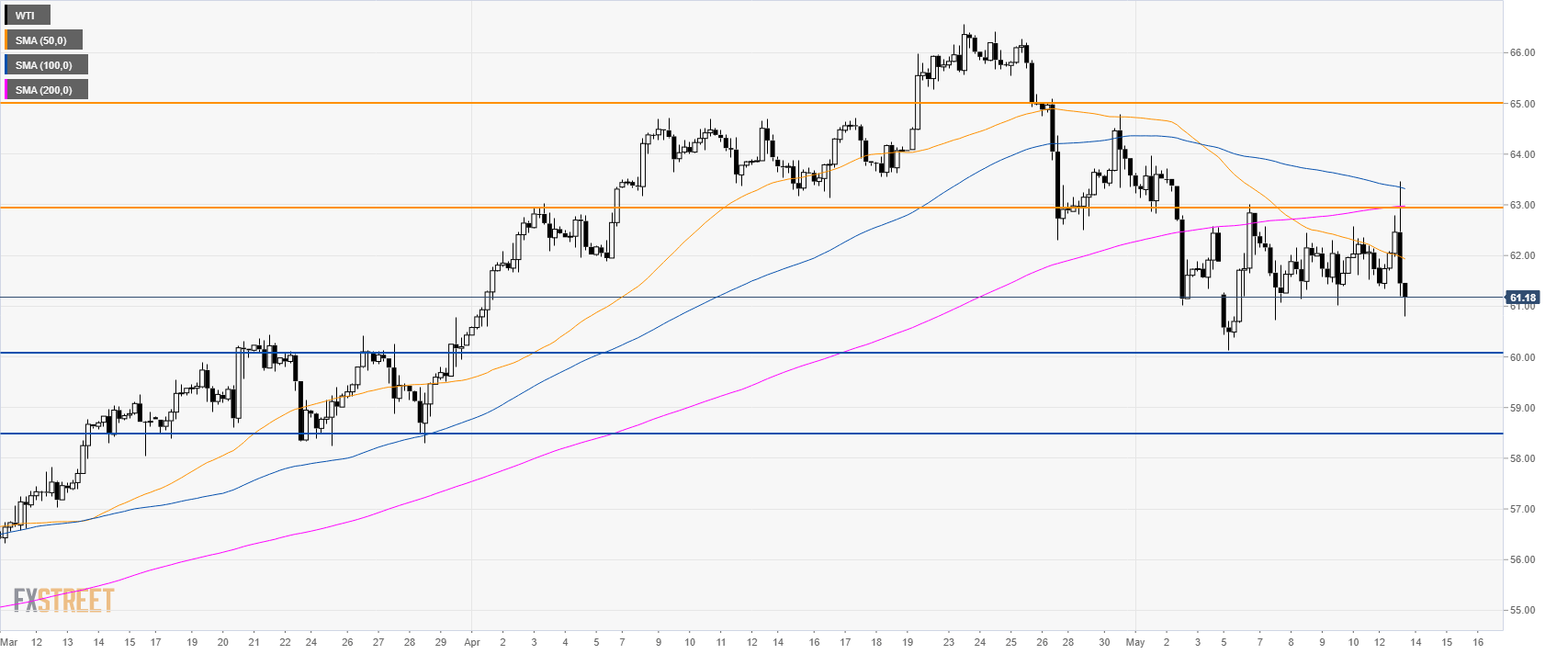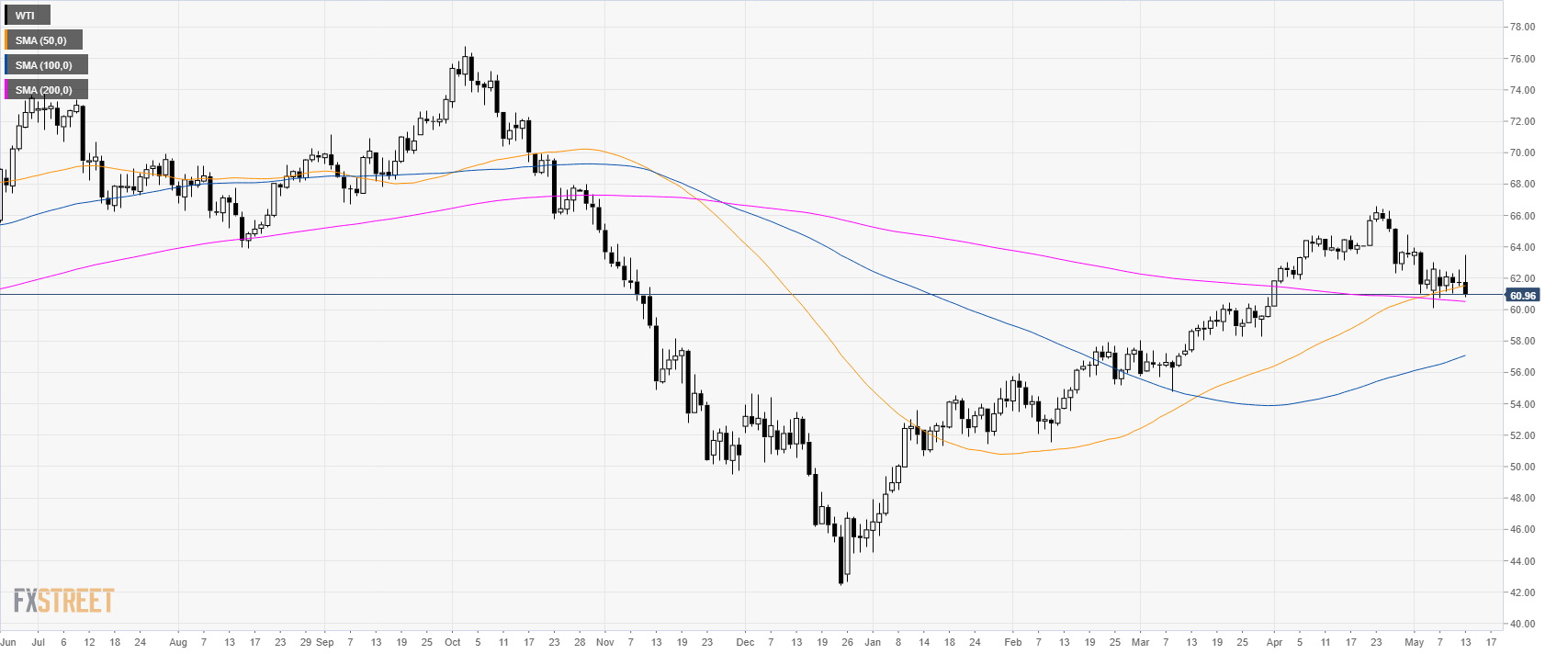 WTI (West Texas Intermediate) is retracing from the highs made in April. In the last 7 days, the market has been stabilizing near $61.00 a barrel. However, the overall picture is turning less bullish with the bears now challenging the 200-day simple moving avearges (SMA).