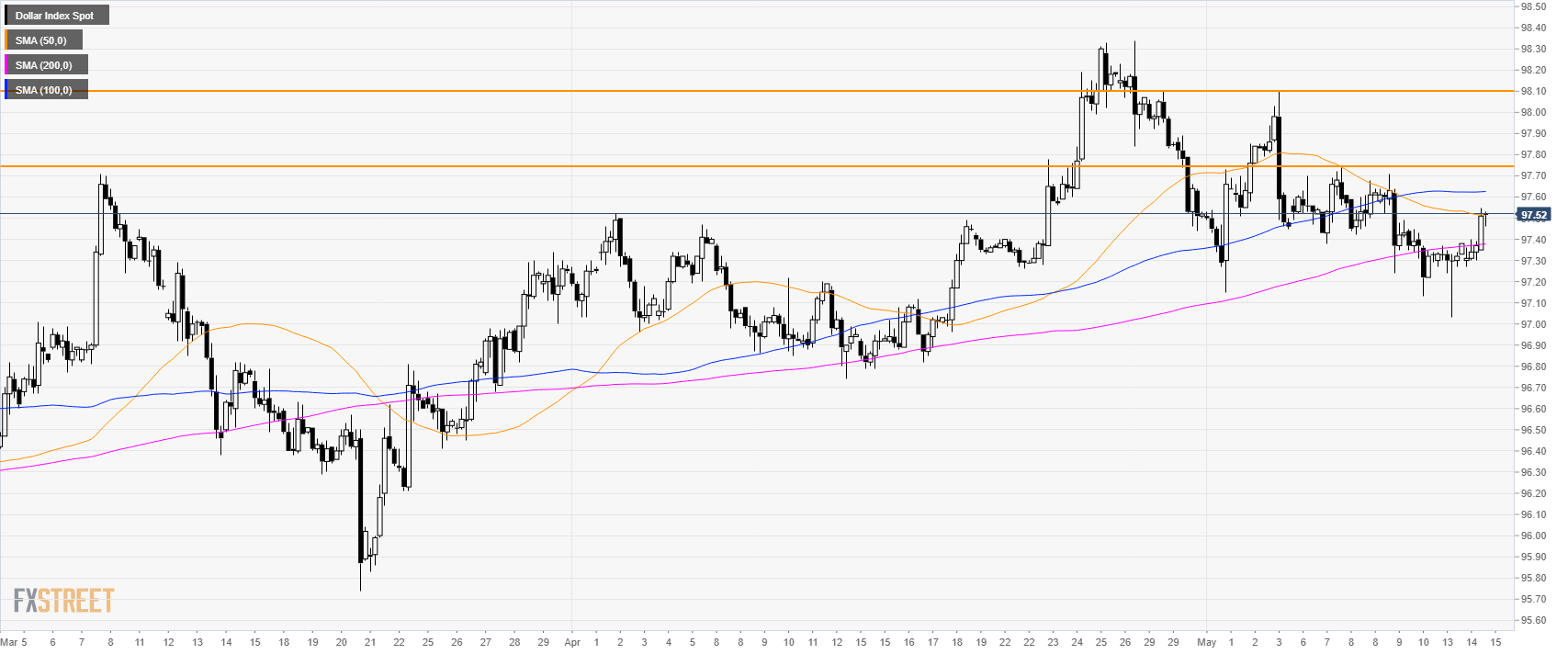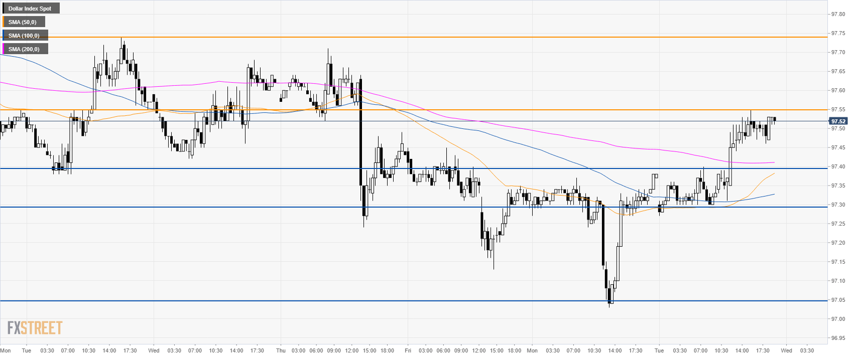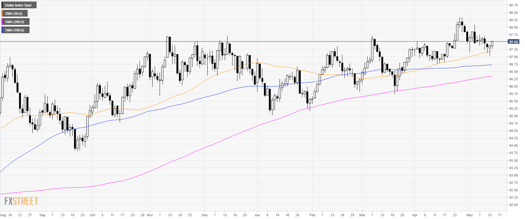 The US Dollar Index (DXY) is trading in a bull trend above its main simple moving averages (SMAs).The index picked up some steam this Tuesday as the market is trading just above the 97.50 level.