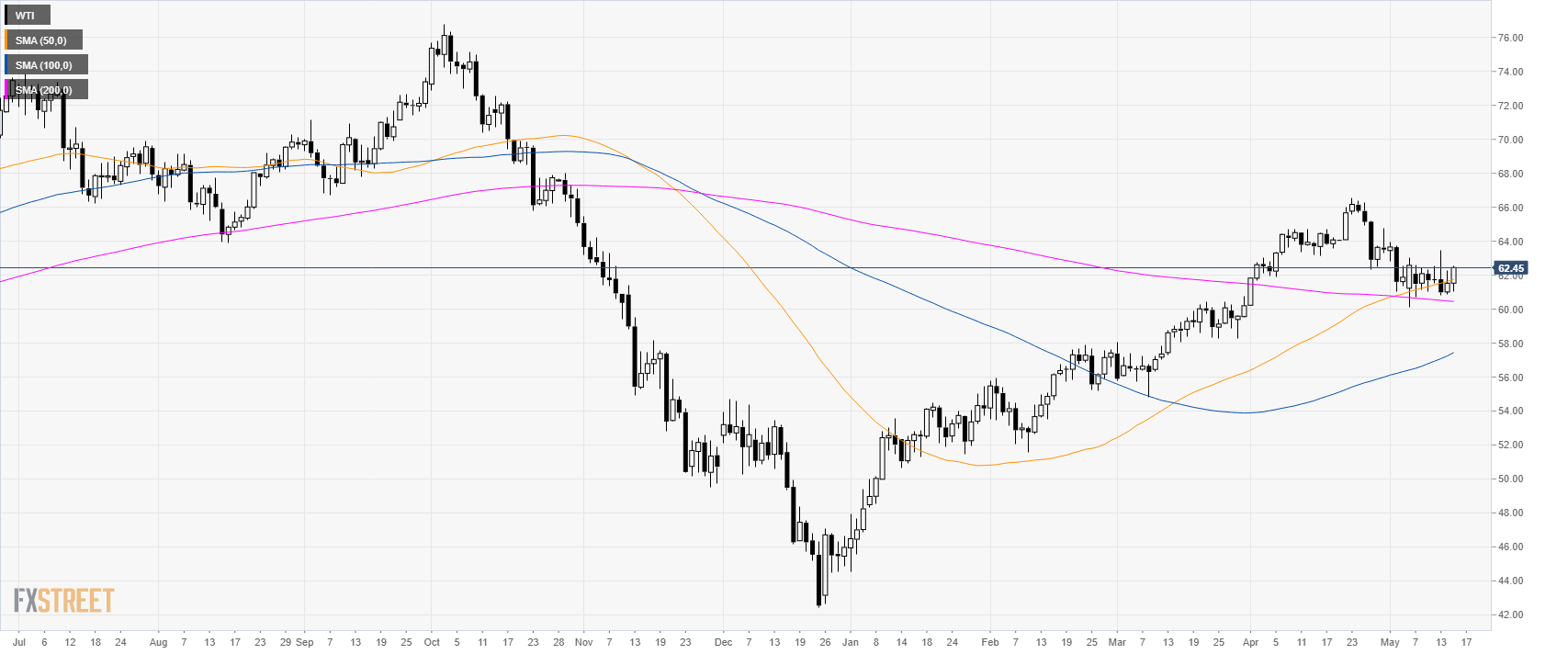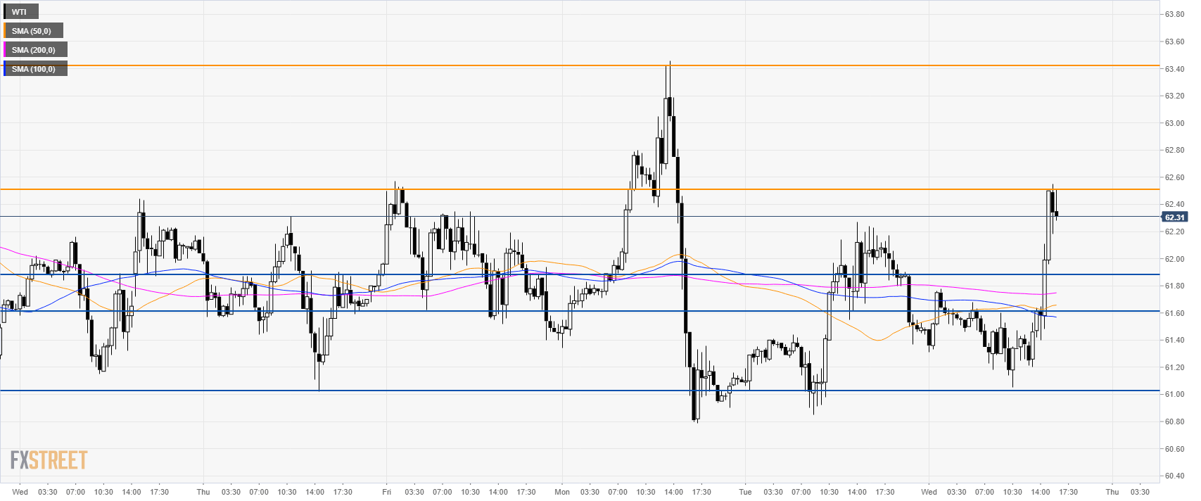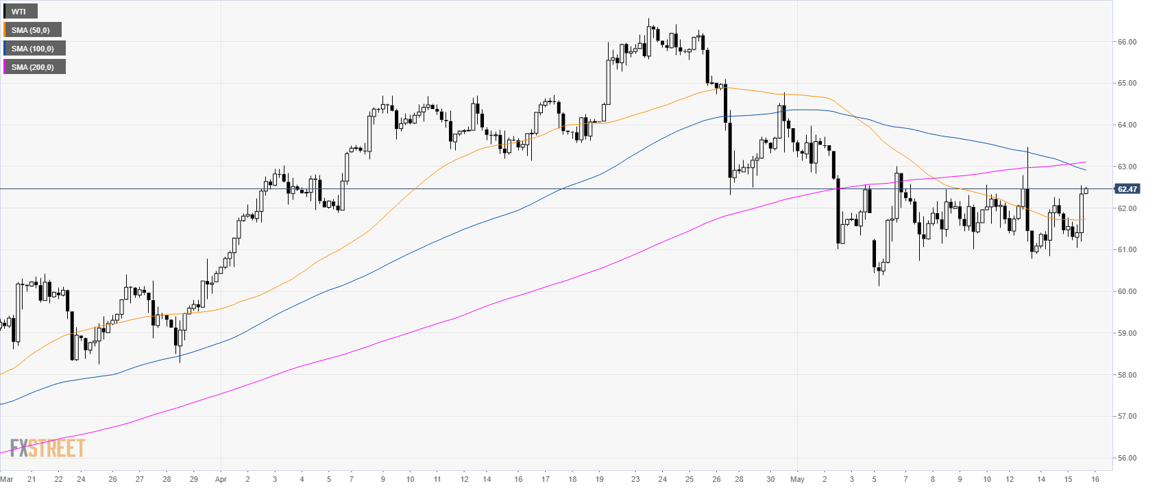 WTI (West Texas Intermediate) is in consolidation mode above its main simple moving averages (SMAs) near $62.00 a barrel.