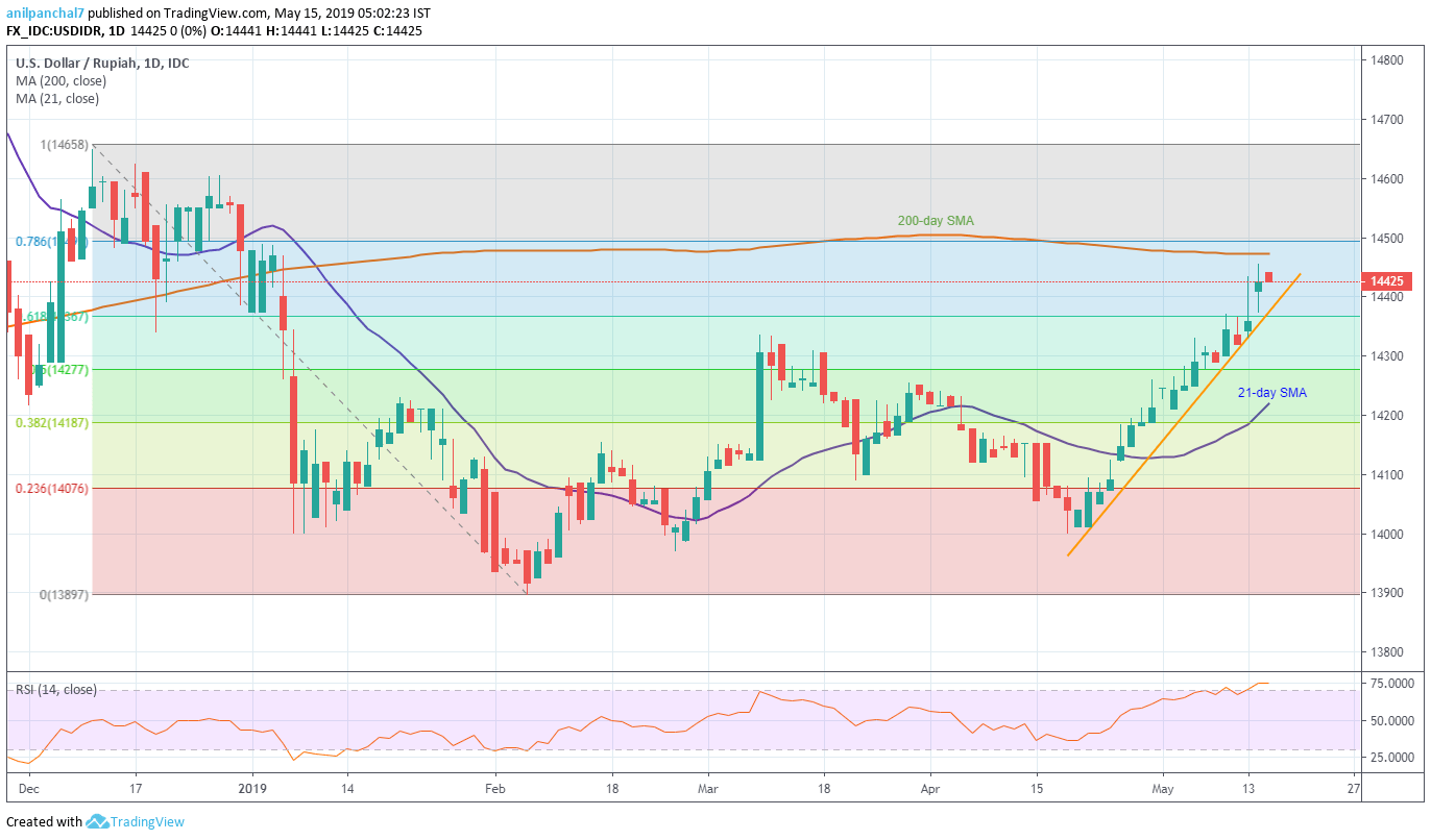 With the overbought RSI levels pulling the pair back from near 200-day SMA, USD/IDR seesaws around 14,425 during the early Asian session on Wednesday.
