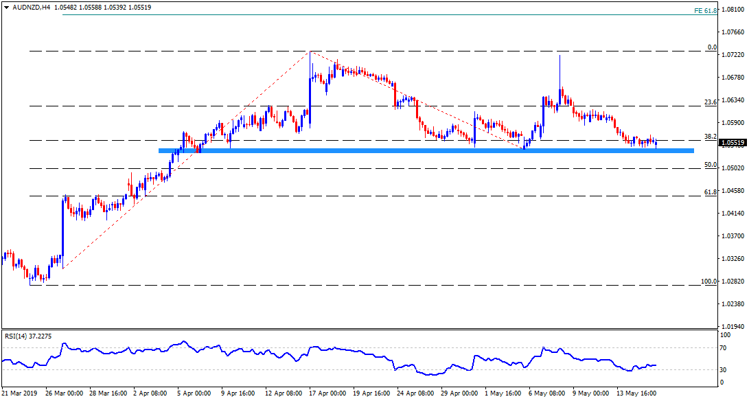 AUD/NZD is taking the rounds near 1.0550 during early Asian sessions on Thursday. The pair is near to 1.0540/30 horizontal support that is restricting its downside since early-April.