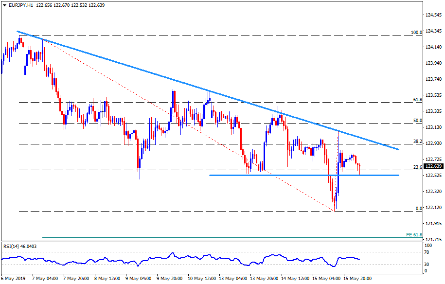 Failure to surpass a downward sloping trend-line since May 07 drags the EUR/JPY pair towards re-testing 122.50 horizontal-support during the early Asian session on Thursday.