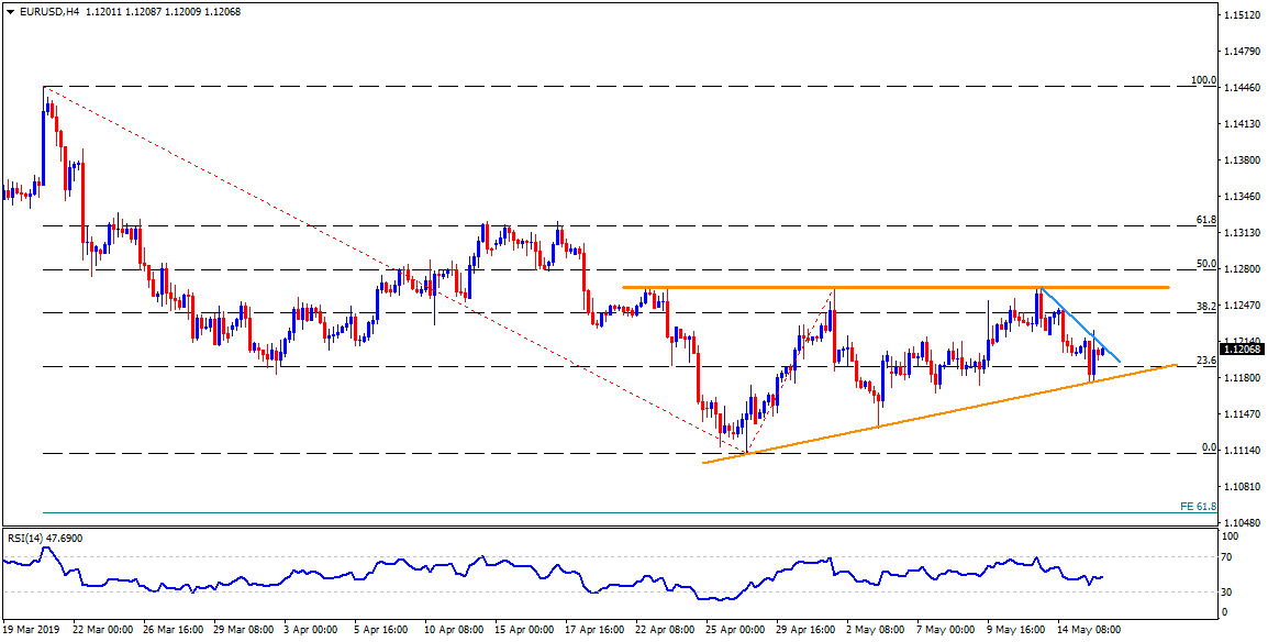 Despite bouncing off the support-line of a short-term ascending triangle, the EUR/USD pair is presently struggling with an immediate resistance-line, at 1.1210, during early Thursday.