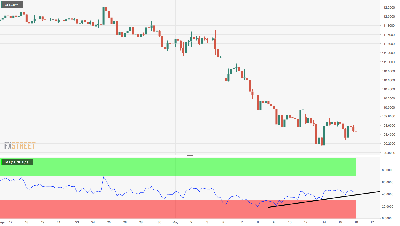 USD/JPY is currently trading at 0.16% on the day at 109.42, but may soon pick up a bid and rise toward 110.00 over the next 24 hours as technical charts are flashing signs of seller exhaustion.