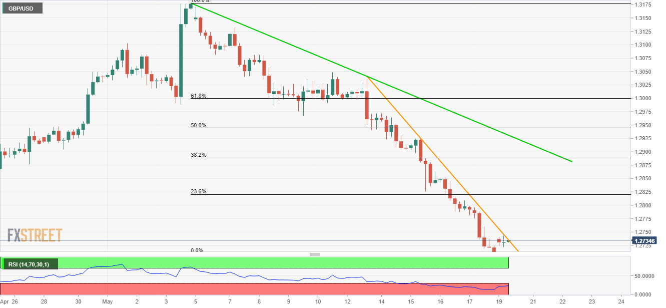 Even if oversold levels of 14-bar relative strength index (RSI) triggered GBP/USD pullback, the quote presently confronts a week-long trend-line resistance near 1.2740 ahead of the UK markets open on Monday.