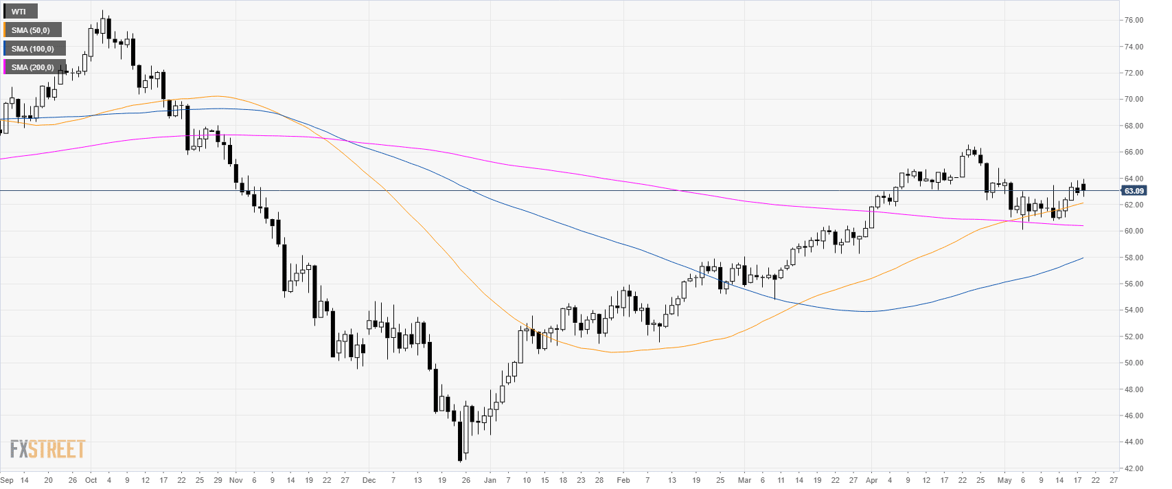 WTI (West Texas Intermediate) is trading in a bull trend above its main simple moving averages (SMAs)