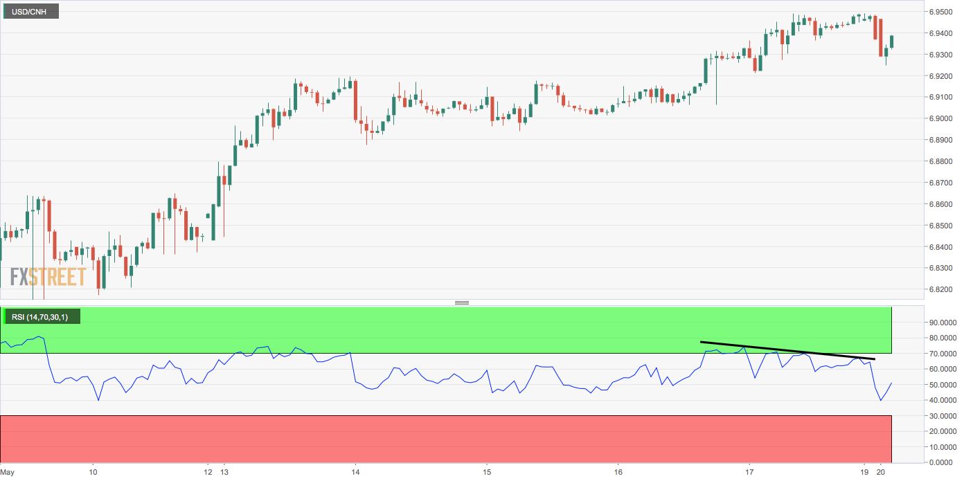 - USD/CNH is down 0.20% on the day with overbought readings on the daily RSI.