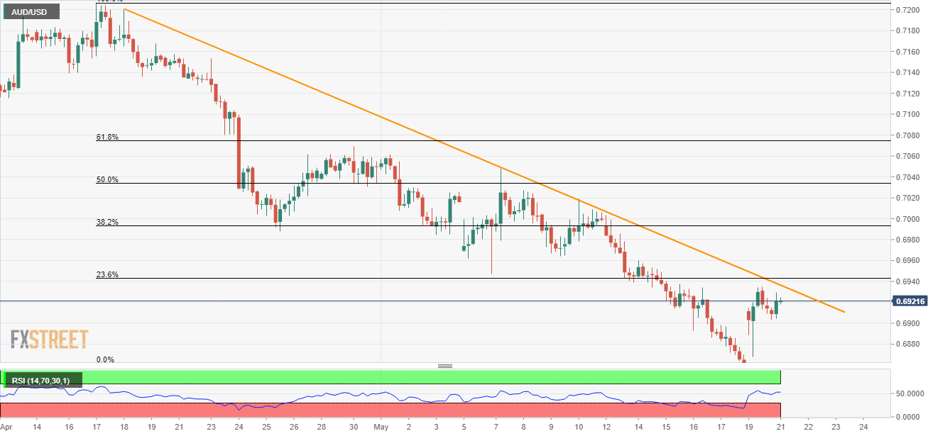 Even if recent positives portray an upbeat scenario for the AUD/USD pair, a downward sloping trend-line since April 18 is still unbroken as the quote seesaws near 0.6925 ahead of the RBA minutes on early Tuesday.