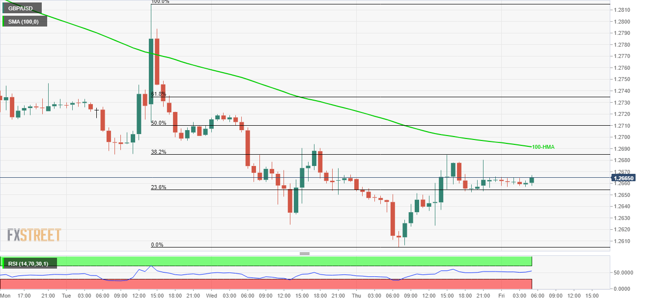 Sustained trading beyond 23.6% Fibonacci retracement of latest downtick helps the GBP/USD pair to currently trading around 1.2665 while heading into the London open on Friday.