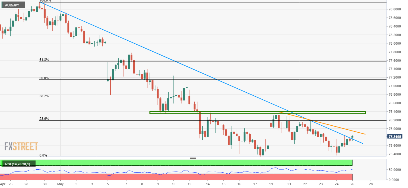 In spite of breaking four-week-old trend-line resistance, the AUD/JPY pair needs to justify the strength of upside momentum by clearing a week-long resistance-line. The quote presently trades near 75.80 during early Monday.