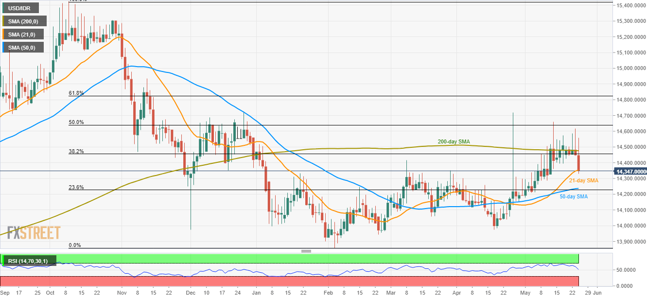 Having failed to successfully cross 200-day SMA, the USD/IDR pair presently tests 21-day SMA as it declines to 14,347 during early Monday.