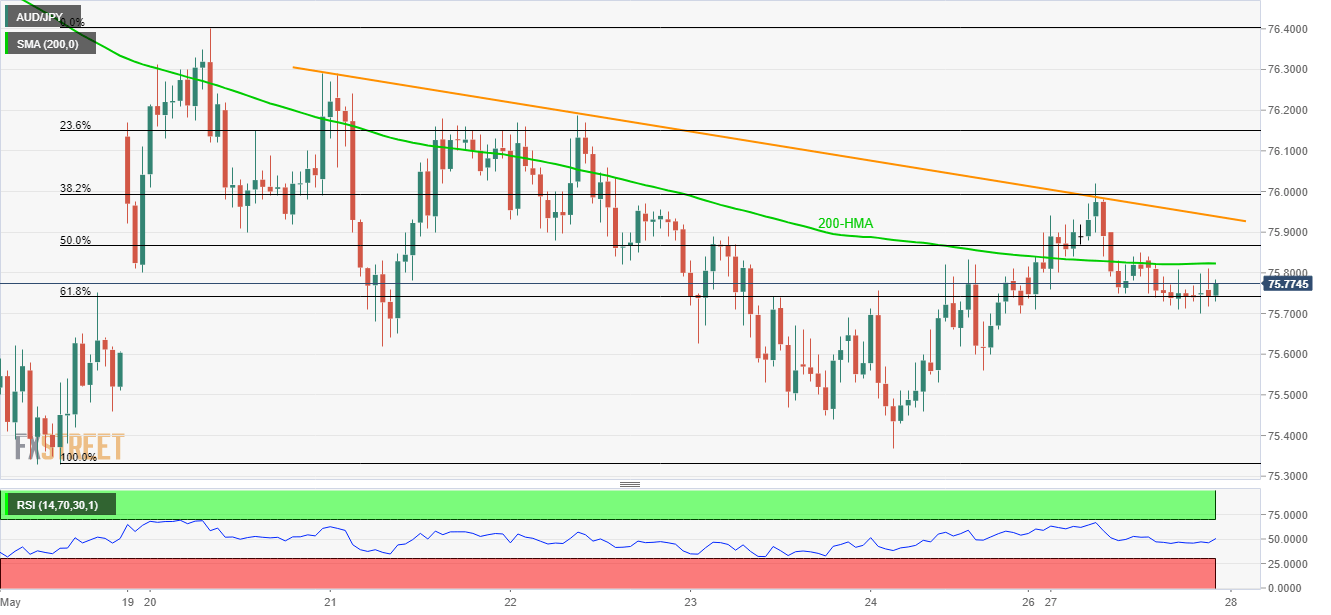 AUD/JPY is modestly unchanged near 75.80 amid initial Asian session on Tuesday. The pair’s downside has lately been confined by 61.8% Fibonacci retracement of its May 17-20 rise while 200-hour simple moving average (200-HMA) seems to limit the near-term upside.