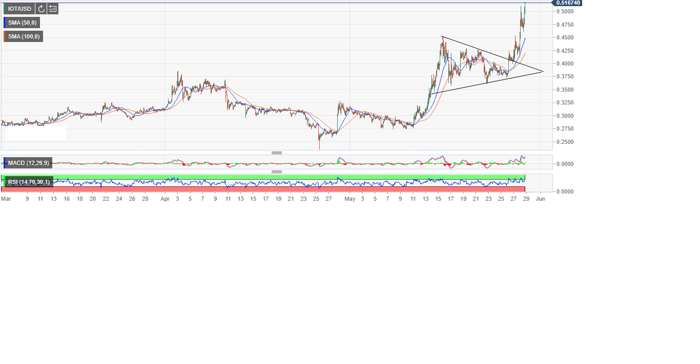The hourly chart for IOT/USD trading pair shows an asset that has entered a bullish zone. The price has been trading higher highs and higher lows from the support formed in the last week of April at $0.23. IOT/USD has explored the levels by breaching several barriers at $0.275, $0.3250 $0.4000, $0.4500 and the recent $0.5000. The formation of a high above $0.5100 coupled with the current building bullish momentum means that the investors’ interest in the token is higher than it has ever been in 2019. All technical signals show that the bulls have the control while the bulls have set their eyes on $0.6000 in the short-term.
