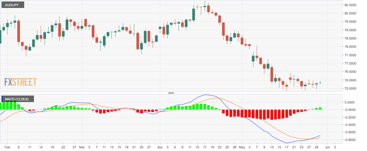 - AUD/JPY’s daily MACD histogram has turned bullish for first since April 22.