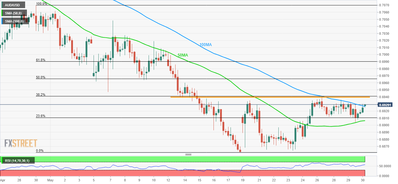 AUD/USD technical analysis: 4H 100MA, horizontal resistance limit upside to 0.6965/70