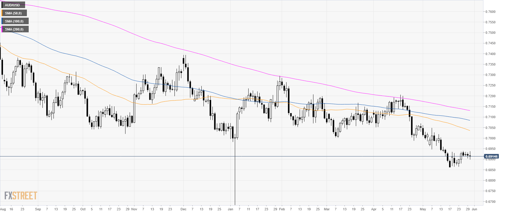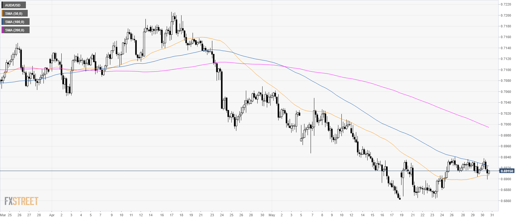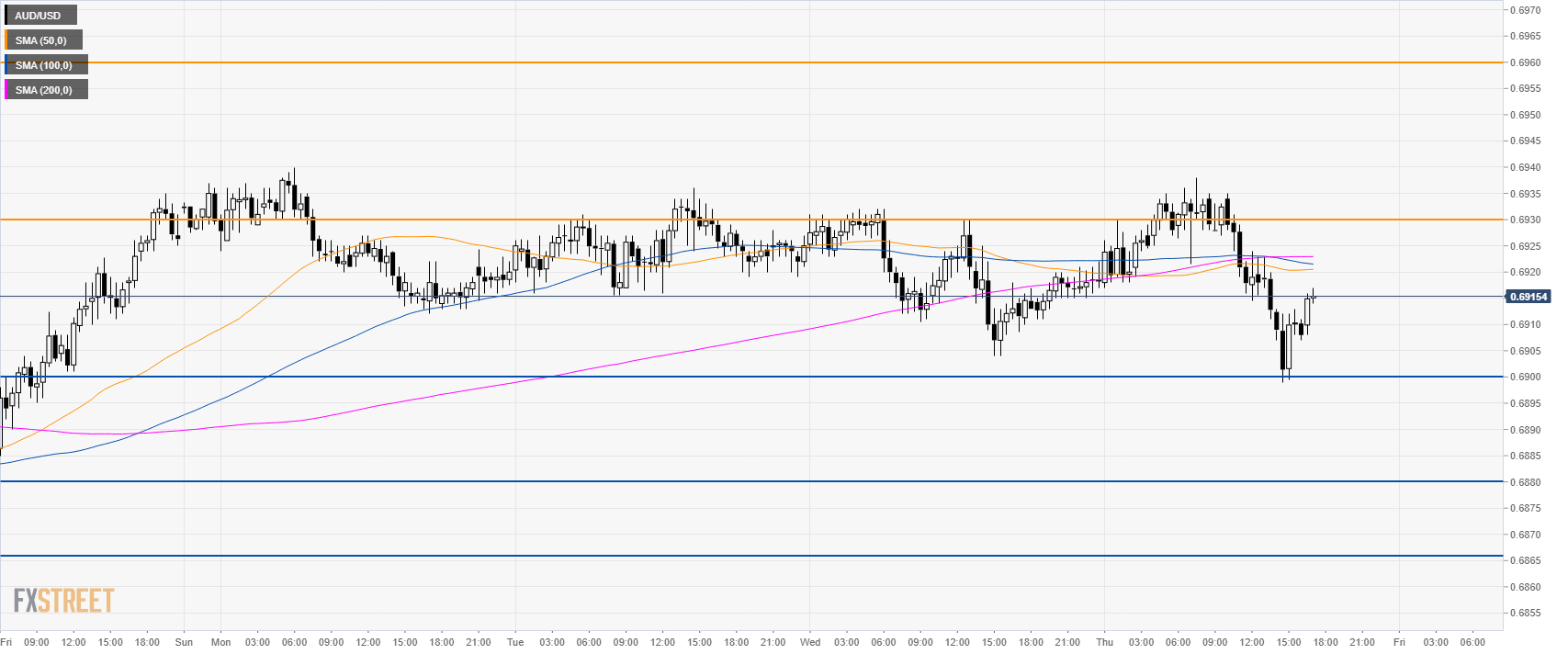 AUD/USD is trading sideways above the 0.6900 figure and trapped between the 100 and 200 SMAs.