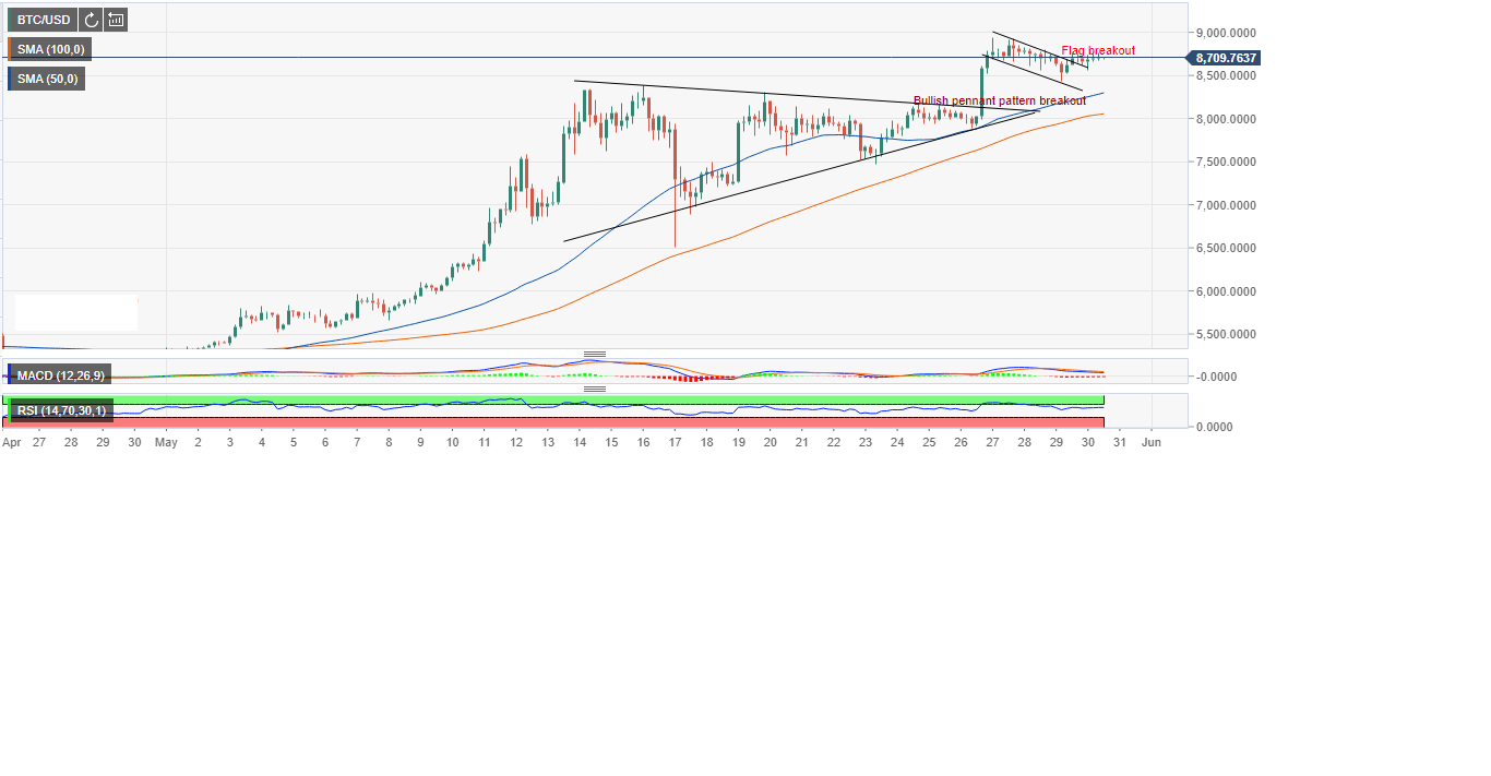 Bitcoin ballistic move on Sunday last week followed the breakout from a pennant pattern as seen on the chart. Due to the stalling below $9,000 Bitcoin formed a bullish flag pattern. Currently, a breakout above the pattern is confirming a bullish momentum that is headed for $9,000 in the near term. The pennant breakout last Sunday had already provided a gateway to $10,000 and the remaining move is to see Bitcoin rising above the resistance at $8,800 and $8,900.
