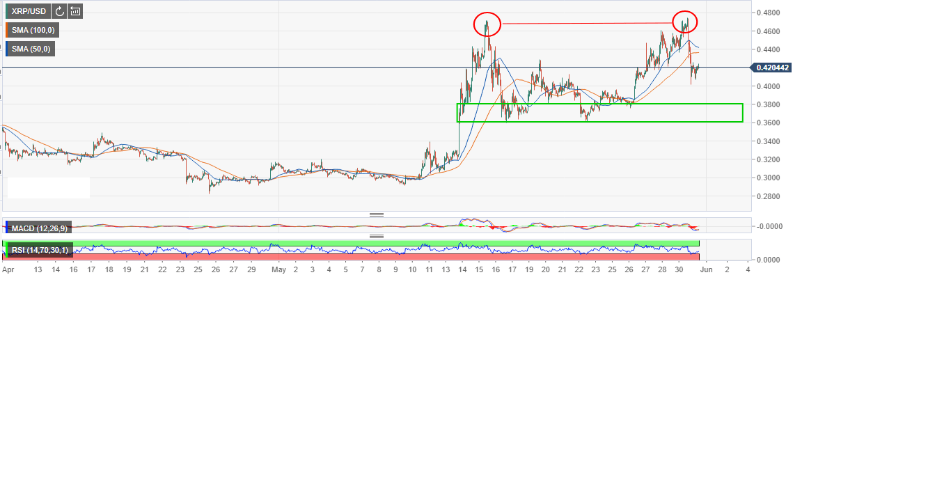 - XRP/USD has bounced off the key support at $0.4000 and is currently trading at $0.4200.