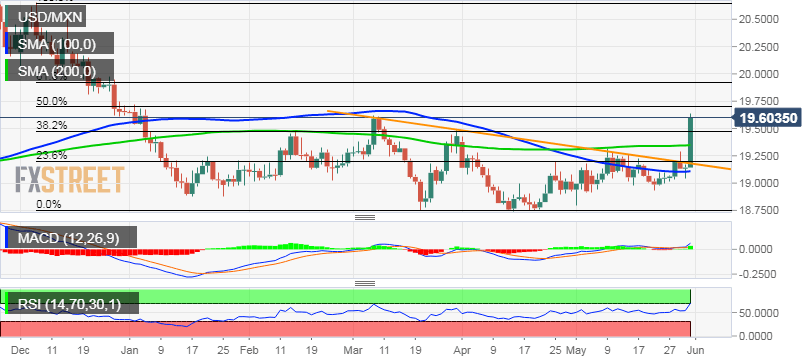 “¢   The Mexican peso was battered after the US President Donald Trump announced new tariffs on Mexico and pushed the USD/MXN cross to its highest level since early-Jan.