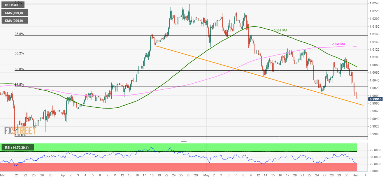 Although failures to cross 100 and 200 HMAs drag the USD/CHF pair to the lowest in two months, oversold RSI may play its role to respect near-term support-line as the quote ticks near 0.9990 during early Monday.