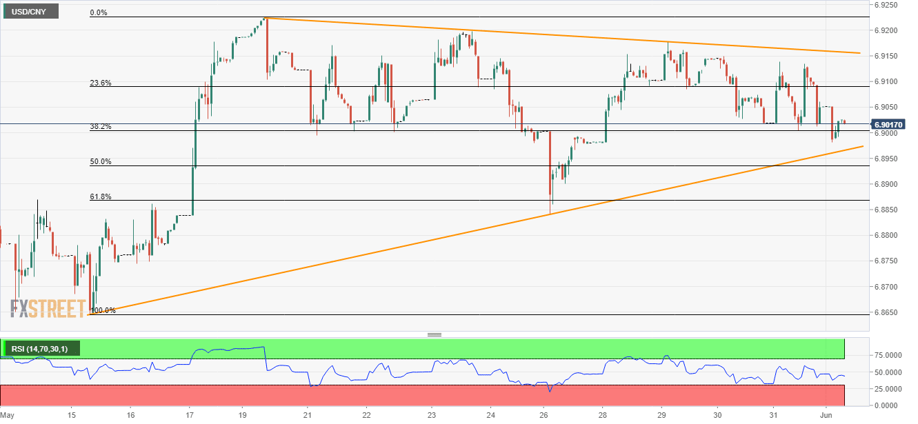 Even after portraying a lower high formation since last two-weeks, the USD/CNY pair is less likely to turn bearish unless clearing a fortnight old ascending support-line. The quote presently takes the rounds near 6.9025 during early Monday.