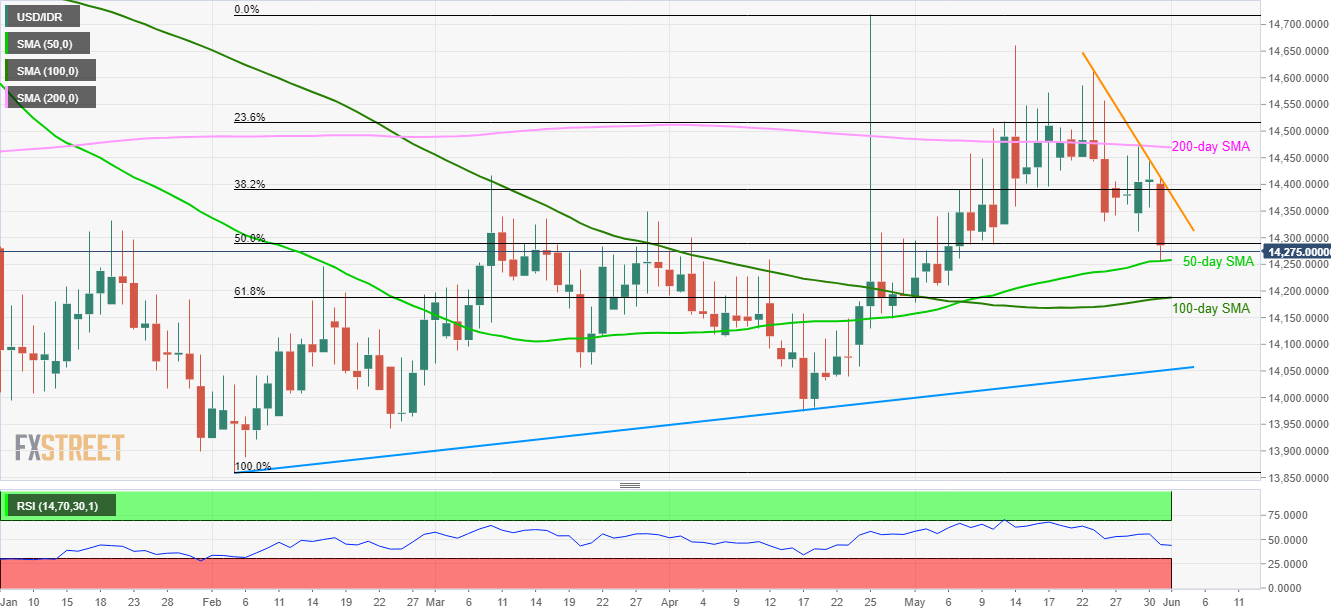 Even if short-term descending trend-line portrays the USD/IDR pair’s weakness, 50-day SMA questions sellers as the quote cling to 14,275 during the early Asian session on Monday.