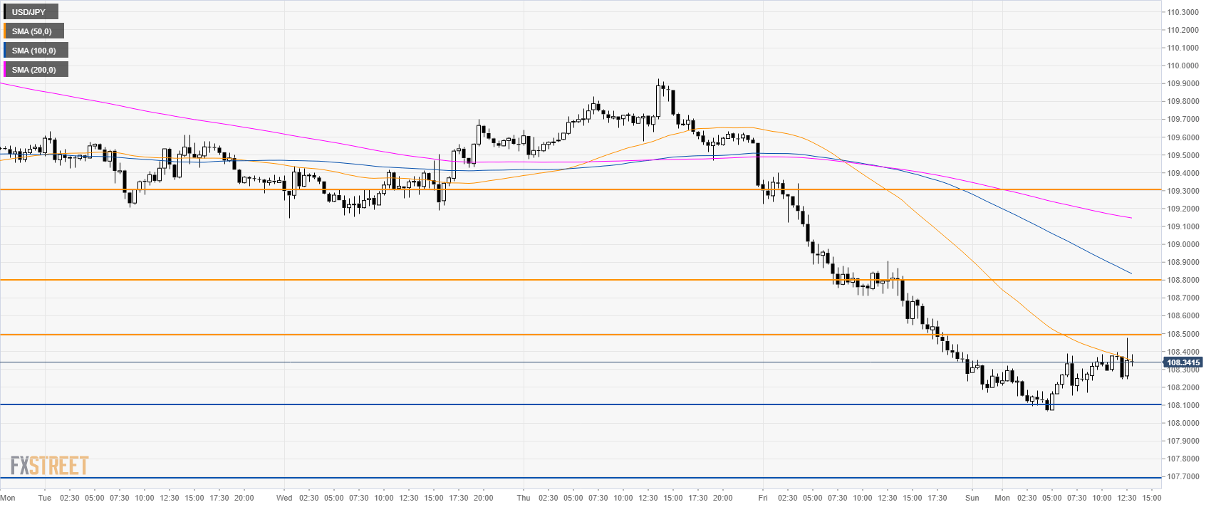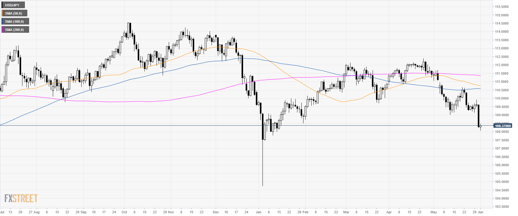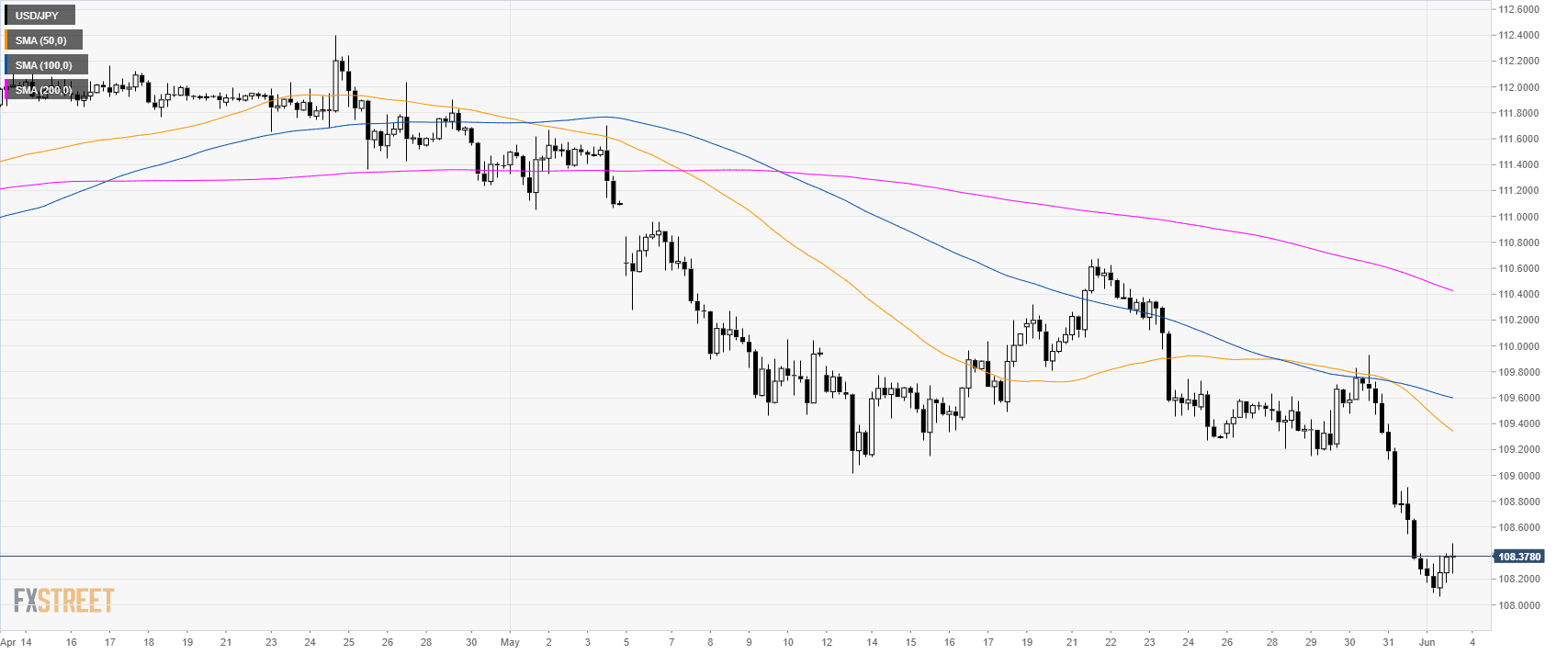 USD/JPY is trading in a bear leg below its main simple moving averages (SMAs) at 4.5-month low.