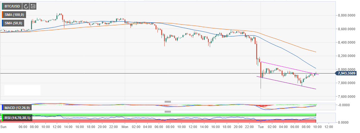Initially, the price consolidates between $8,600 and $8,400 for most of the trading on Monday. However, some bearish indicators like the shorter term 50 Simple Moving Average (SMA) crossing below the 100 SMA 15-minutes gave the sellers confidence. Moments before the close of the session on Monday, a bearish wave swept across the that sent Bitcoin in a tailspin dropping below key support levels at $8,200 and $8,000 before finding balance at $7,800.