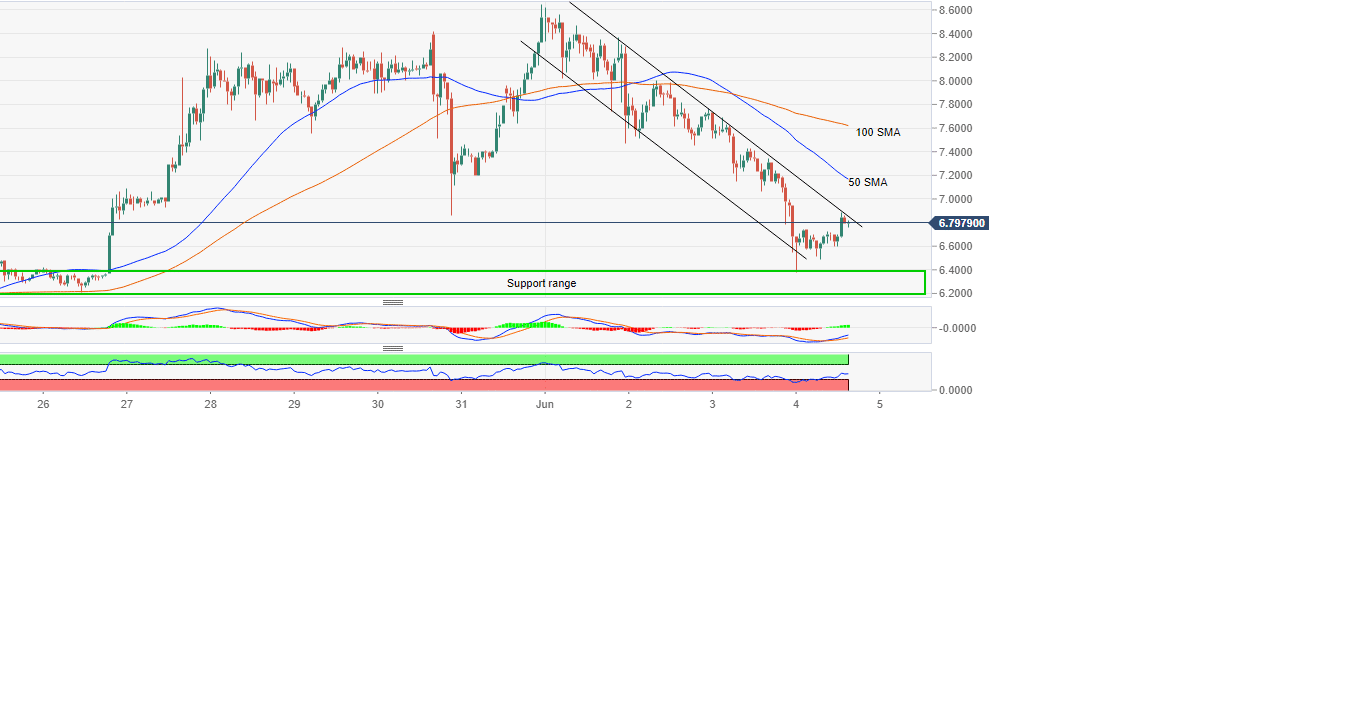 At press time, EOS is trading at $6.77 amid a growing bearish momentum on the failure break above the descending channel resistance. Since the beginning of June, EOS has been forming a lower low pattern within the falling channel. Attempts to correct above this hurdle have been futile.