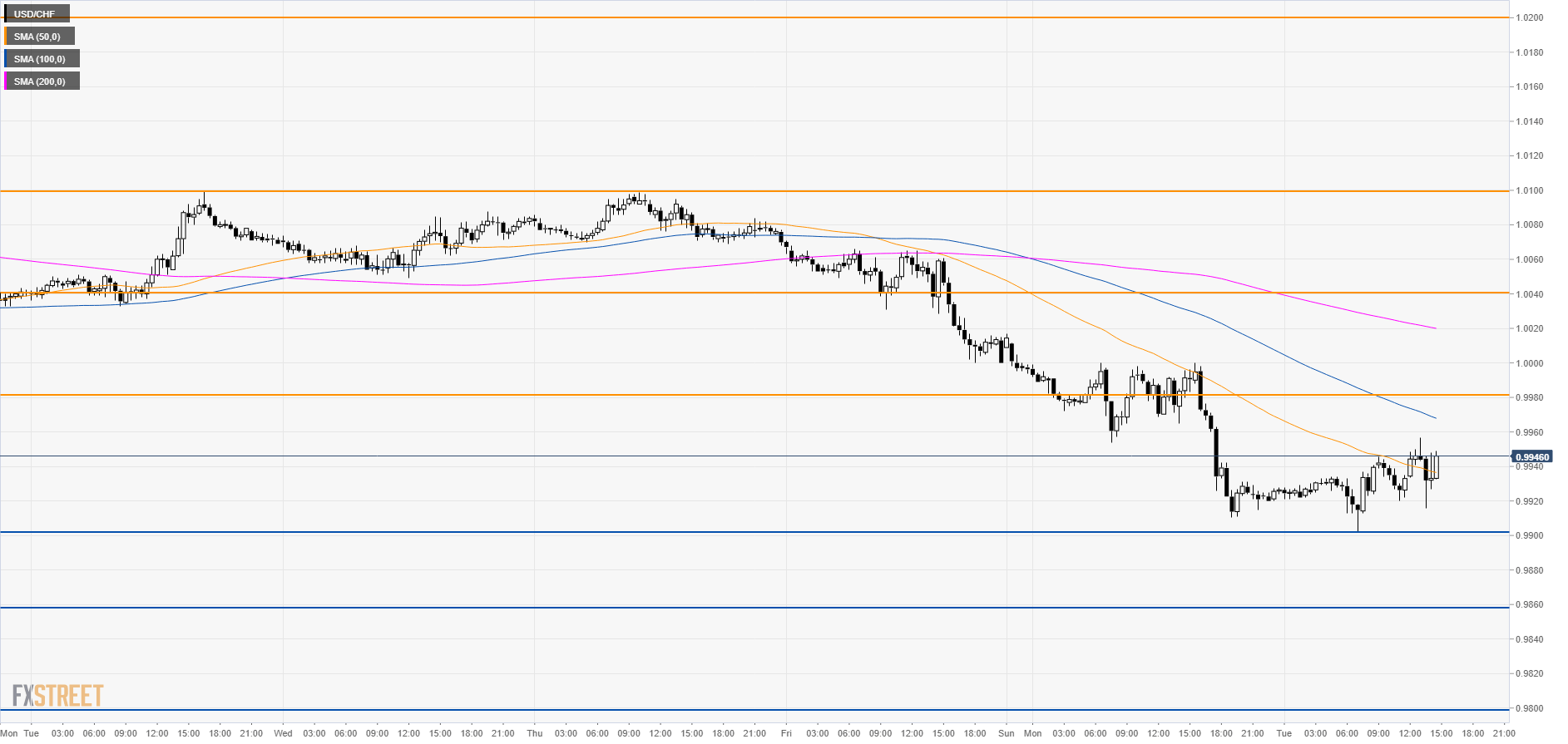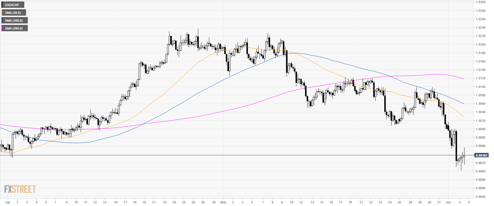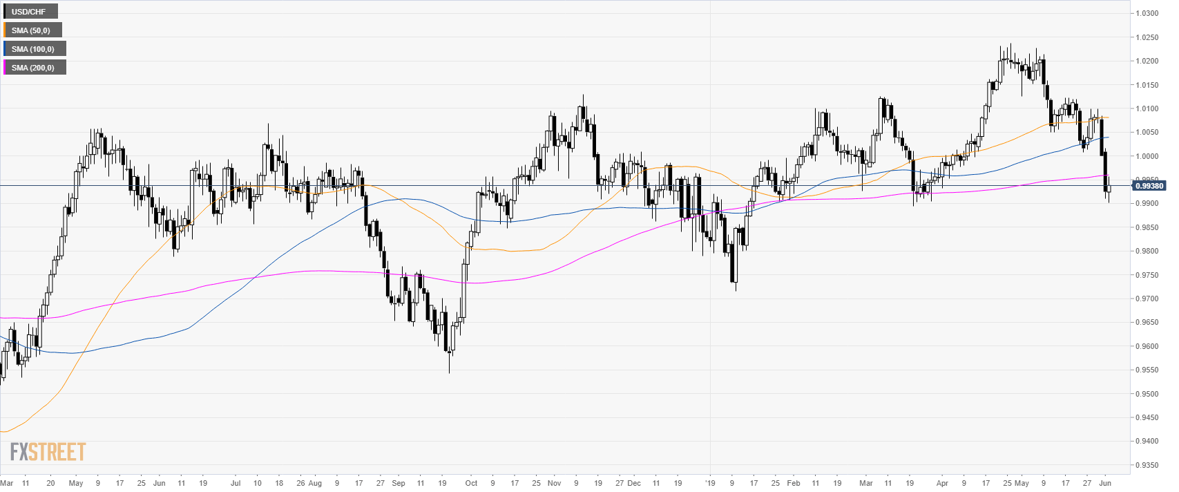 USD/CHF is trading below the parity level and its main daily simple moving averages (DSMAs).