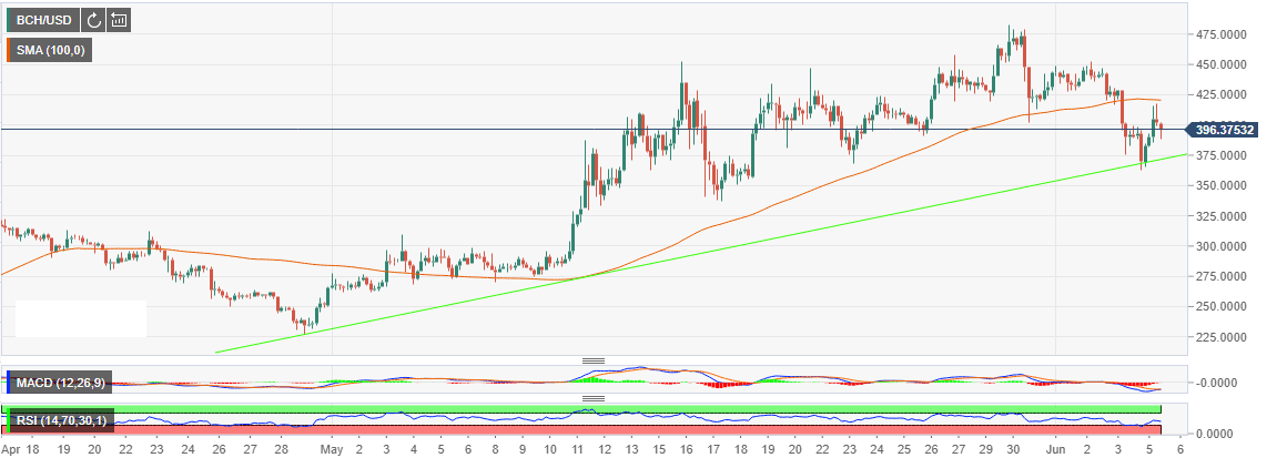 The 4-hour chart shows an asset that is still trading above a rising trendline despite the correction from the new 2019 highs. There has been a correction from the support at $360 where Bitcoin Cash pulled above $400 but the upward momentum died short of 100 Simple Moving Average currently at $420.81.