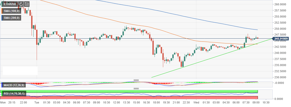The intraday charts show Ethereum having increased its value by 2.19% on the day from the intraday low of $240.19. Ethereum extended the declines on Tuesday below $240 support and formed a low at $234.20. This allowed the bulls to put their foot down and push for a reversal forming a new uptrend towards $250.