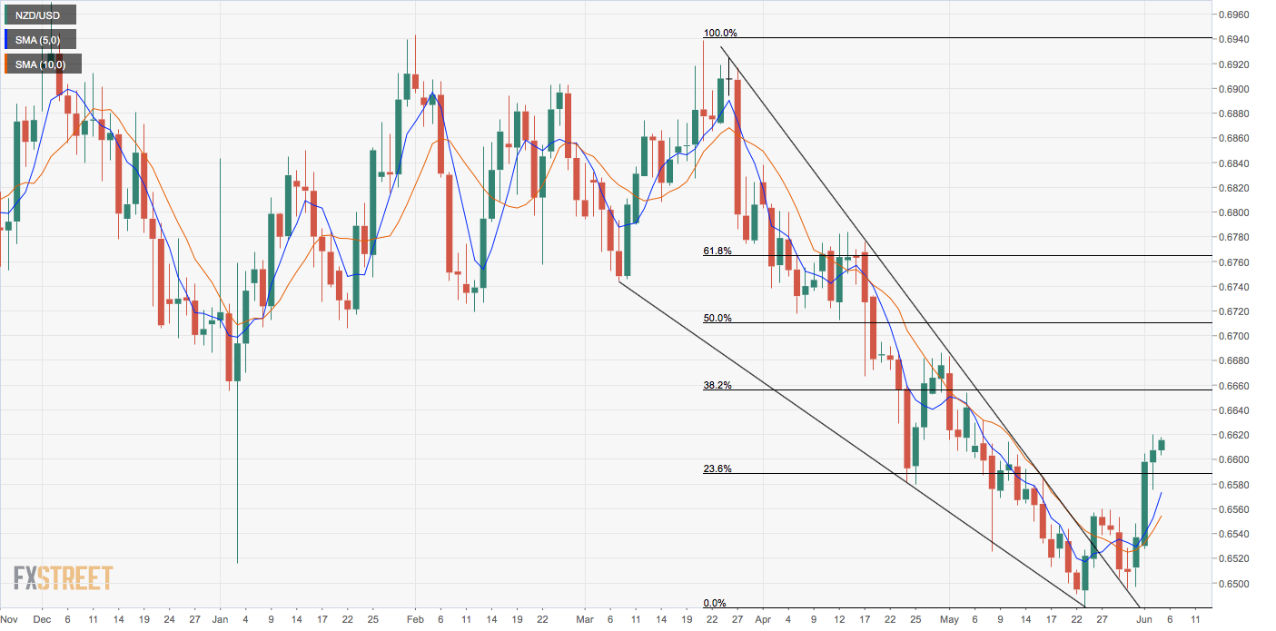 NZD/USD is currently trading at 0.6614, representing 0.15% gains on the day and could test supply around the 50-day moving average (MA), currently at 0.6640, in the next few hours.